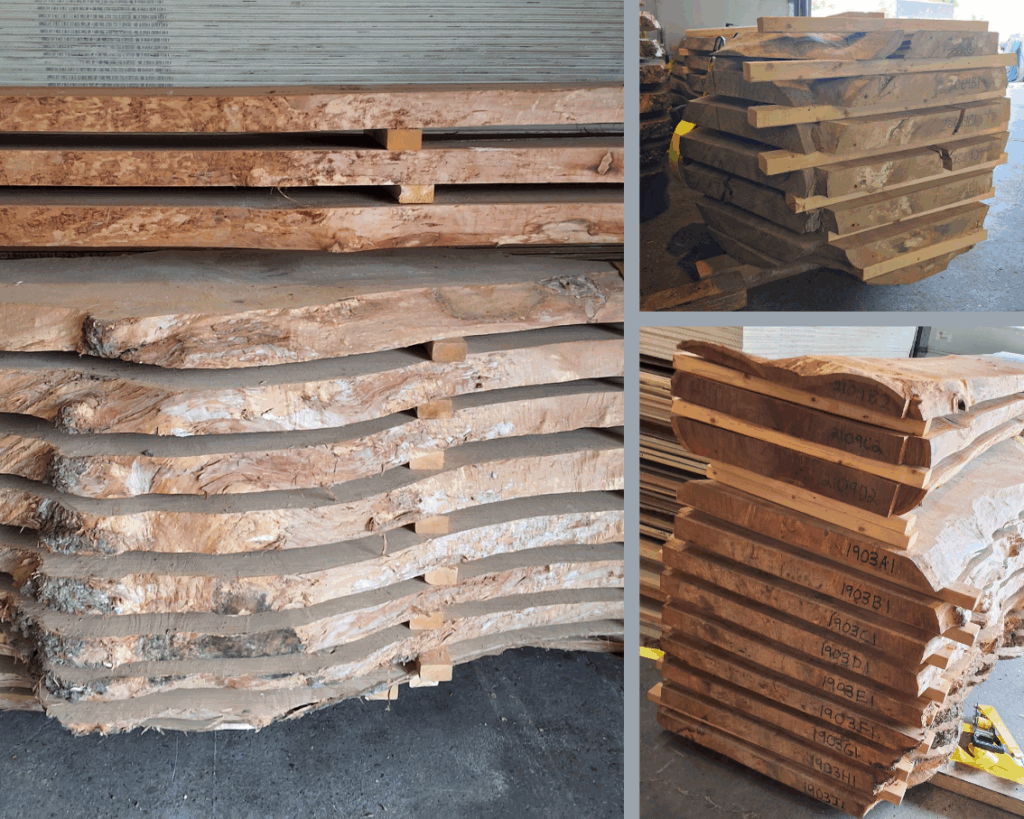 A “boule” (I thought you’d never ask!) is a whole butt – or base – log that has been sawn into boards or slabs, and stacked sequentially in the sequence they were cut. A few mills will sell them like this, rather than sawing the logs in whatever way produces the most lumber. “Who cares?” one might ask. “What difference does it make?” Well, getting the lumber from the same log enables the user to perfectly control grain and color. As you all know, there can be obvious variations in those characteristics, from one log to another, within the same species of wood. These become evident when you are gluing up boards/slabs to create a wide table or bar top. They also can be very obvious when boards are end matched, such as in flooring. With cheaper grades of flooring, sometimes the grain and color of different pieces can be so far apart that it looks downright ugly.
