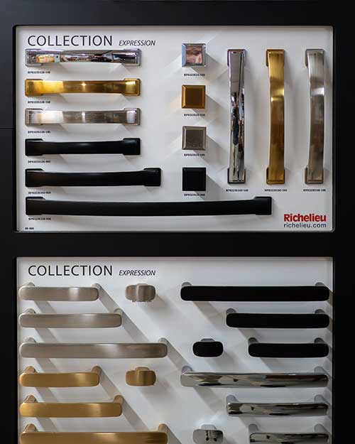 Hinges, drawer slides, pulls, knobs, handles, and specialty hardware in a range of finishes.