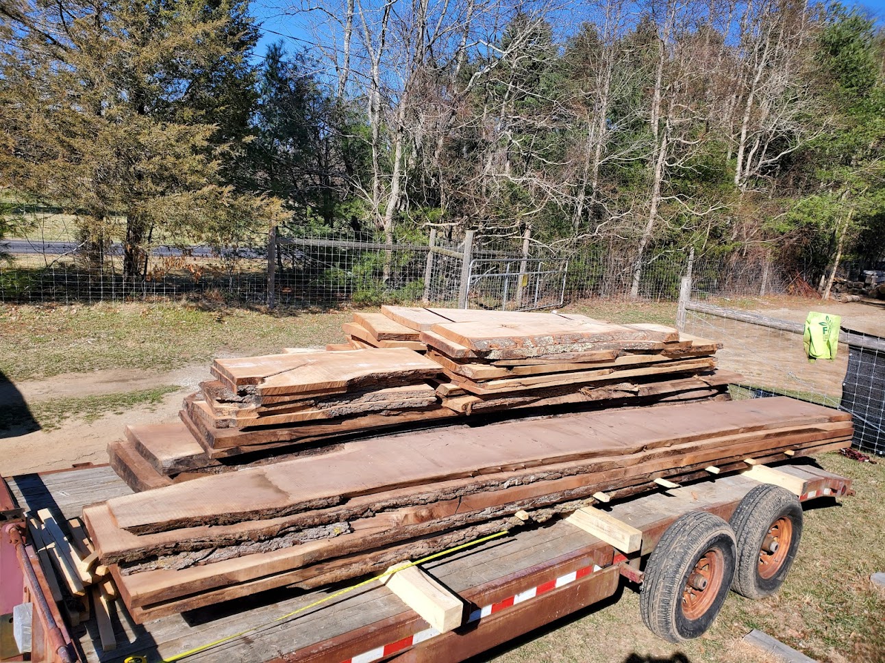 I am always on the hunt to buy wide hardwood slabs from our network of small sawmills, but it gets harder and harder to find them, as demand is high. Walnut is always scarce, because there just aren’t that many Walnut trees here in New England. Tree companies come across them occasionally when a homeowner calls and wants a damaged one removed, but it’s usually just one tree, unlike other hardwood species. The owner of one sawmill called me the other day and told me he had just taken a pile of live edge Walnut slabs out of the kiln, and was giving me first crack at them. I said I would come down the next day, and he said I would not be disappointed!