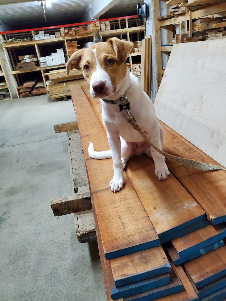 New additions to our inventory include units of 4/4 and 5/4 White Oak, 4/4 Tigerwood, and a company mascot, featured here standing on a unit of Tigerwood. He belongs to a co-owner, Dovi, and his name is “Snoopy.” (Yeah, I know—a bit corny—but he is one lovable dog, and he does resemble the Snoopy from “Peanuts.”)