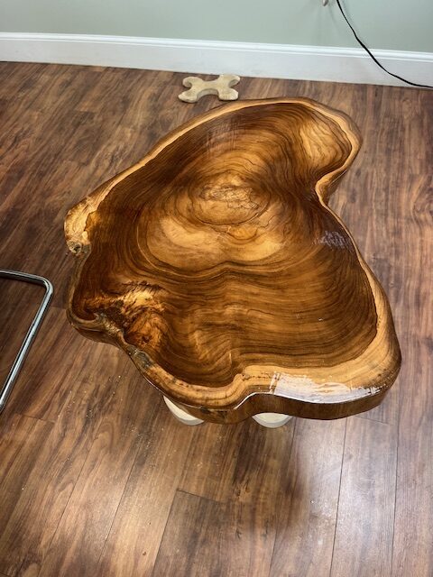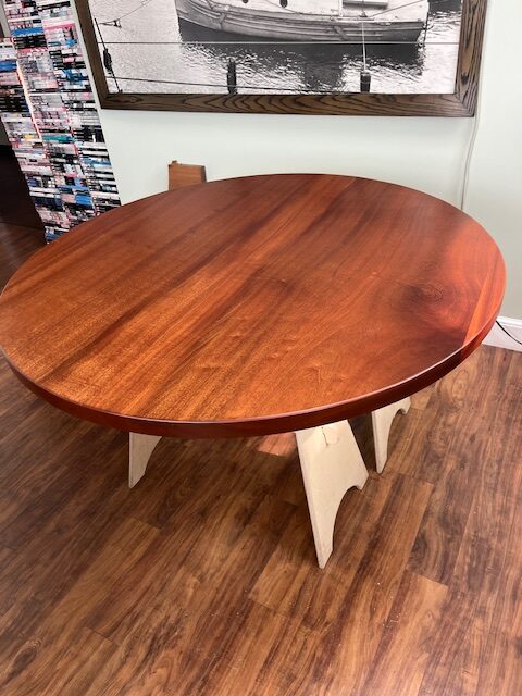 Below are two photos. The first, an end table we made from a Teak “cookie”, with a high gloss brushed poly finish. The second is the round table-top, built from 8/4″ Sapele Mahogany. This table was made for a very discerning client, who graciously allowed me to print his comments. Here’s what he had to say: